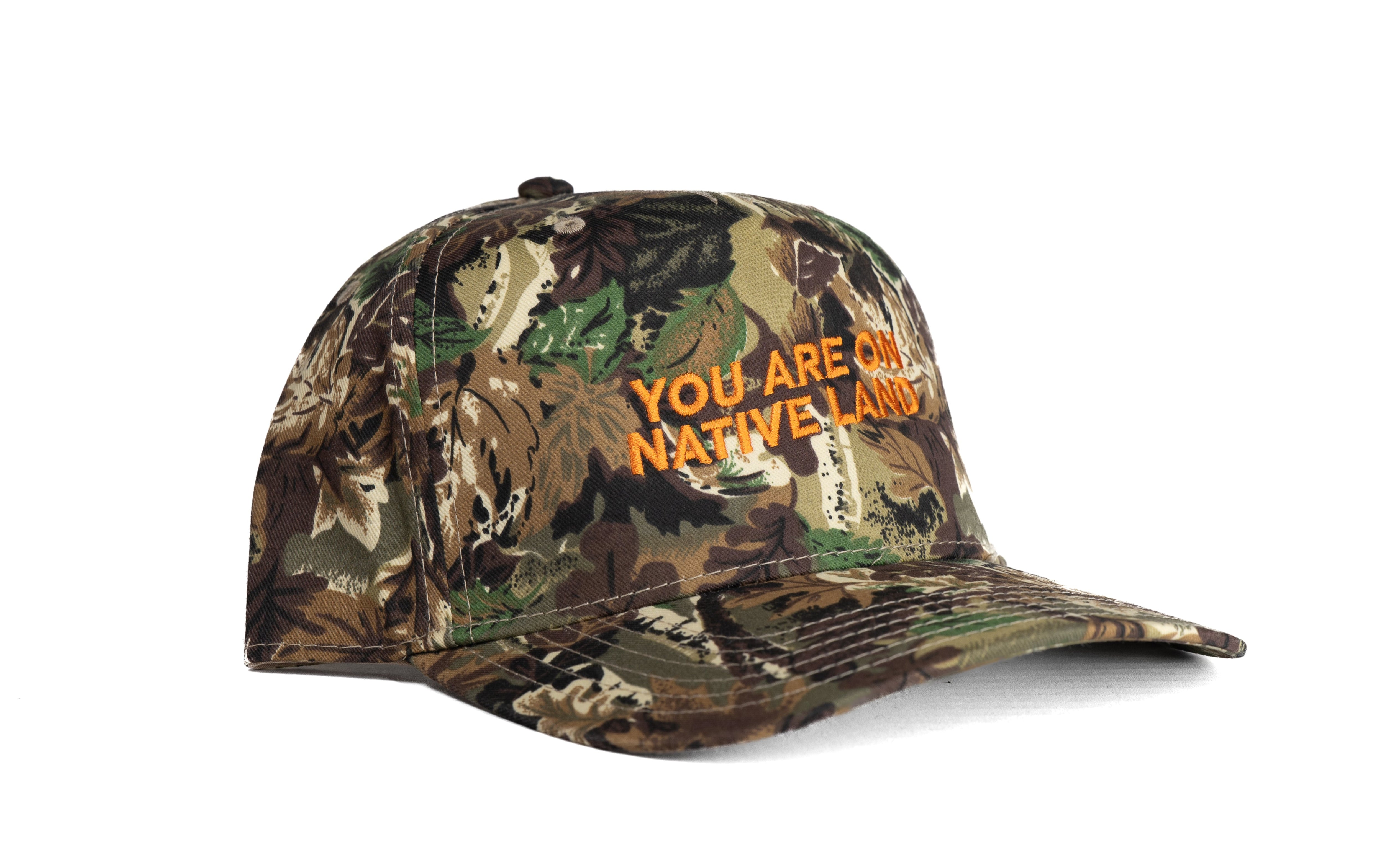 The ‘You Are On Native Land’ Camouflage Cap continues one of Urban Native Era’s most recognized statements. Designed as an everyday staple, the piece carries a message intended to spark awareness and conversation across communities. Available in white or orange embroidery.