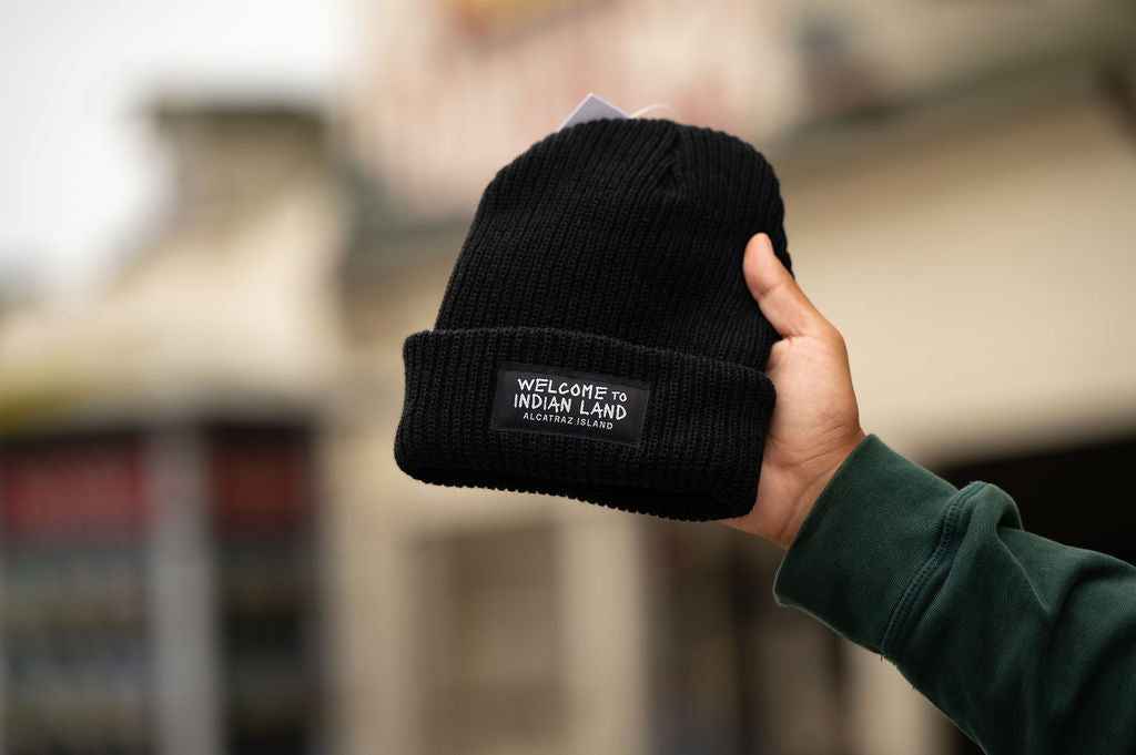 Our popular beanie silhouette now features a new label, 'Welcome to Indian Land'. 100% Made in Lenapehoking.